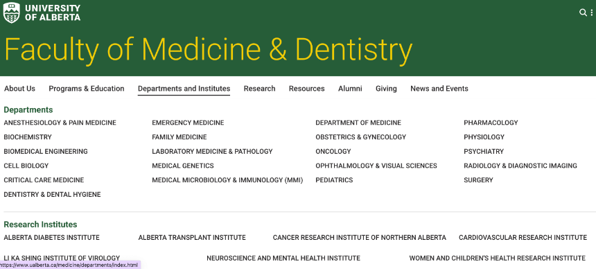 If you click this link and go to the University of Alberta faculty of medicine and Dentistry website, you can click on the Departments and Institutes to find the links to individual departments.
